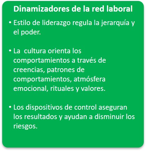 - Identificar los dinamizadores de la red organizacional y definir junto con el equipo de liderazgo las características que se deben mantener, eliminar o incorporar.